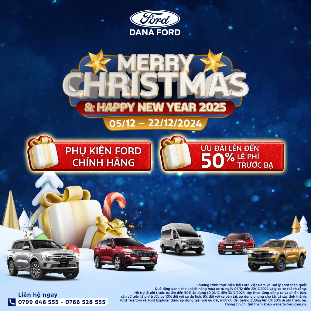 Nhân dịp Giáng Sinh và Chào đón năm mới 2025, Ford Việt Nam kết hợp với hệ thống Đại lý trên toàn quốc tổ chức chương trình “Mua Xe Ford - Rước An Lành - Hanh Thông Năm Mới” với nhiều chương trình quà tặng và ưu đãi hấp dẫn dành cho khách hàng mua xe Ford.