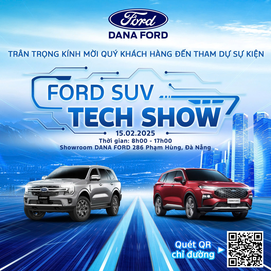 Ford SUV Tech Show là sự kiện lái thử và trải nghiệm dòng xe SUV Ford Everest và Ford Territory do Ford Việt Nam và Dana Ford tổ chức thực hiện. Với mục tiêu mang đến cho khách hàng những trải nghiệm về công nghệ cùng các tính năng thông minh bật nhất của hai dòng xe này, sự kiện hứa hẹn sẽ mang đến những trải nghiệm ấn tượng cho khách hàng. Bên cạnh đó là những ưu đãi hấp dẫn dành riêng cho khách hàng đến tham gia sự kiện. Đăng ký để cùng tham gia ngay thôi nào!!