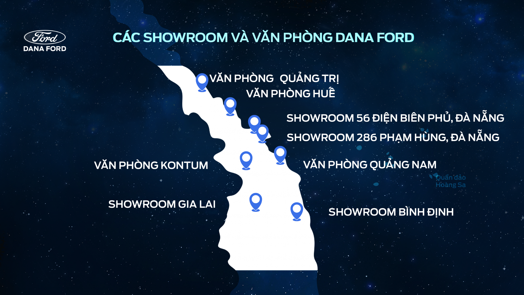 Dana Ford (Công ty Cổ phần DANA ) là đại lý 5S uỷ quyền chính thức của Ford Việt Nam, được thành lập vào ngày 16 tháng 6 năm 1998. Với trụ sở chính tại số 56 Điện Biên Phủ, Phường Chính Gián, Quận Thanh Khê, Thành phố Đà Nẵng. Cùng với đó, Dana Ford sở hữu hệ thống showroom, khu văn phòng trải dài khắp các tỉnh Quảng Trị, Huế, Đà Nẵng, Quảng Nam, Bình Định, Gia Lai, Kon tum; Dana Ford tự hào là đại lý có quy mô lớn nhất và được trang bị hiện đại nhất tại khu vực miền Trung – Tây Nguyên.